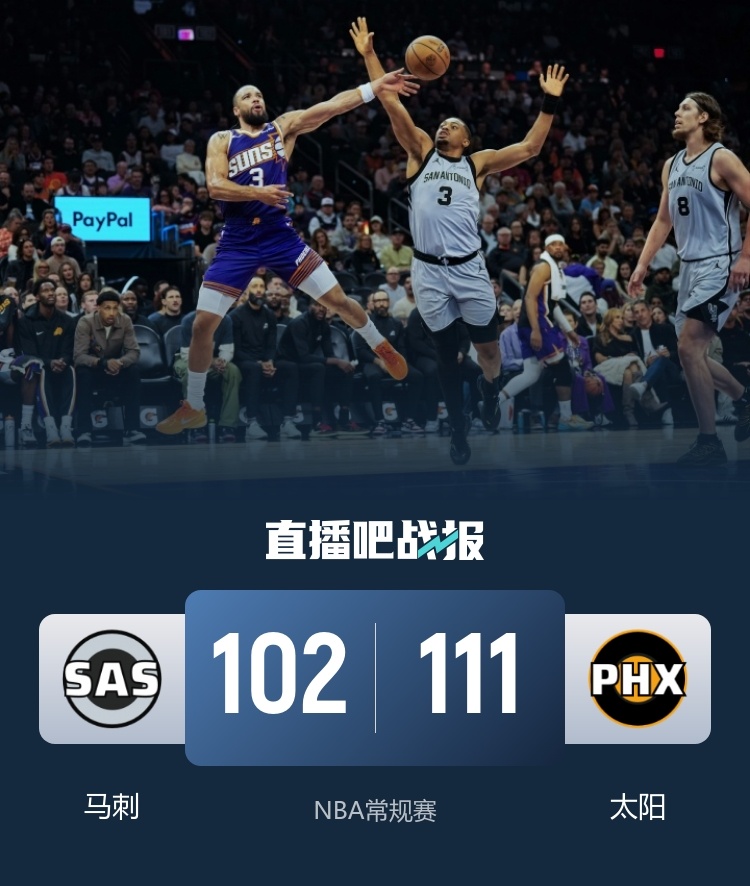 11月24日讯 NBA常规赛继续进行,马刺客场挑战太阳,此前马刺一波三连胜后以11胜4负位列西部第四,太阳则是以10胜6负排名西部第六,此役文班亚马等人继续缺阵。
